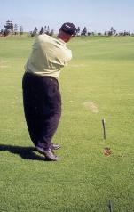 (Above) Notice how the club points at the line during the backswing. It continues to point at the line, or down the line, until the club is parallel to the ground. When the club is parallel to the ground the shaft is parallell to the target line. (Far right above) As my club travels slightly past waist-high the grip end of the club points down the line toward the target. As long as one end of the club points at the target line the swing remains on-plane. Doing so when the club is swinging from waist-high to waist-high satisfies tracing the line. |