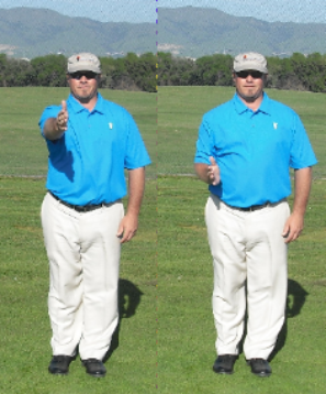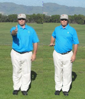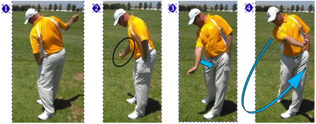 of you (see pictures). For left-handed golfers hold your left arm out in front of you. With your arm in front of you tuck your elbow in front of your body. Tuck it