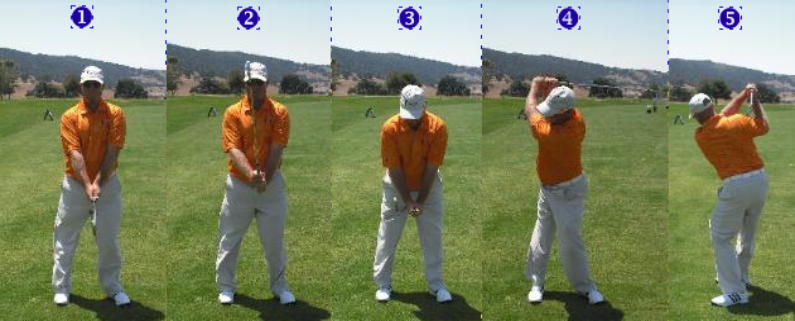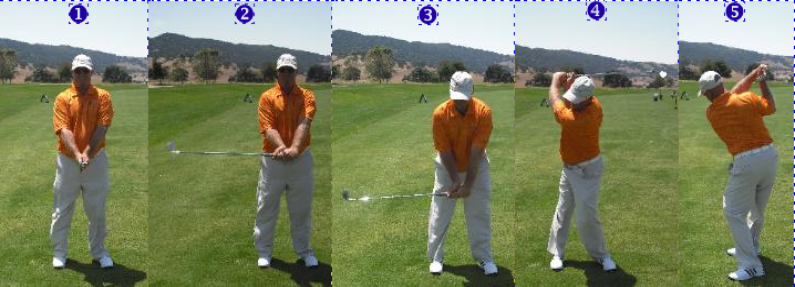 bend from your waist and assume an athletic posture. (4) Finish off the backswing while maintaining the vertical